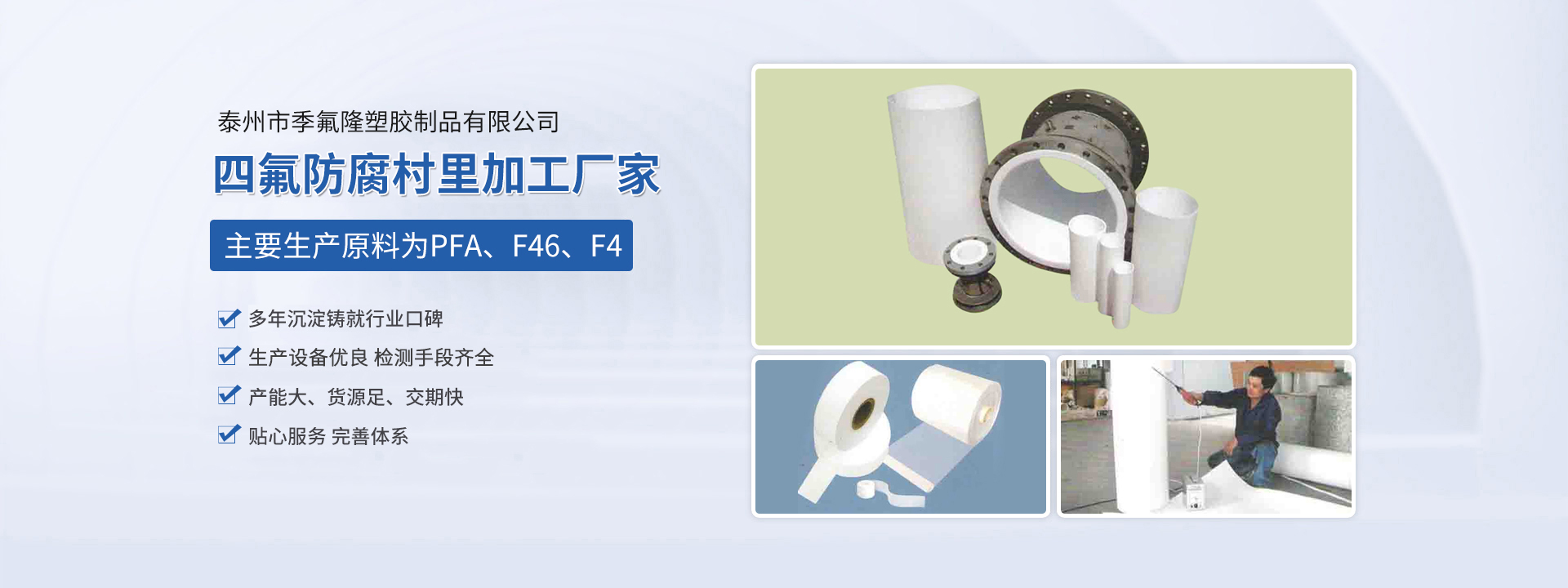 泰州市季氟隆塑膠制品有限公司(江蘇斯瑞沃爾科技發(fā)展有限公司)占地8000平方米,各類專用生產(chǎn)設(shè)備三十多合,現(xiàn)有員工近20人,其中技術(shù)人員10名,均多年從事該行業(yè)生產(chǎn),經(jīng)驗豐富。本公司主要生產(chǎn)原料為PFA、F46、F4,主要為電磁傳感器、防腐管道、各種容器反應(yīng)釜三通四通彎頭及各種閥門等產(chǎn)品進行防腐村里加工,長期為德國、日本、美國、新加坡等國在華合資公司配套,產(chǎn)品廣泛應(yīng)用于環(huán)保、油田、化工、造紙、冶金等行業(yè),產(chǎn)品質(zhì)量優(yōu)良,服務(wù)及時周到,一直深受顧客信賴。